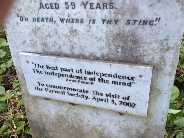 One such woman was Anna Parnell, founder member of the Ladies Land League, an organisation set up to fill the void left as the men from the Irish Land League were imprisoned after it was declared illegal in 1881. The ladies resisted with force and determination the eviction of tenants with great success. However when the men, including her brother, Charles Stewart Parnell, were released from jail, the Ladies Land League was sidelined. Anna left Ireland disillusioned, changed her name and never spoke to her brother again. She died a lonely death in Illfracombe (Northern Devon) 20 September 1911. Five people attended her funeral, her family being unaware of her death. Later her sister, Theodosia Paget, erected the headstone and a plaque was placed on it in 2002 by the Parnell society with a quote from Anna: