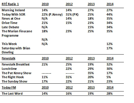Today FM’s The Last Word increased from 14% in 2010 to 28% in 2014 and this is also welcome. Hopefully this trend of including female expertise will continue and will be adopted across the Irish media.